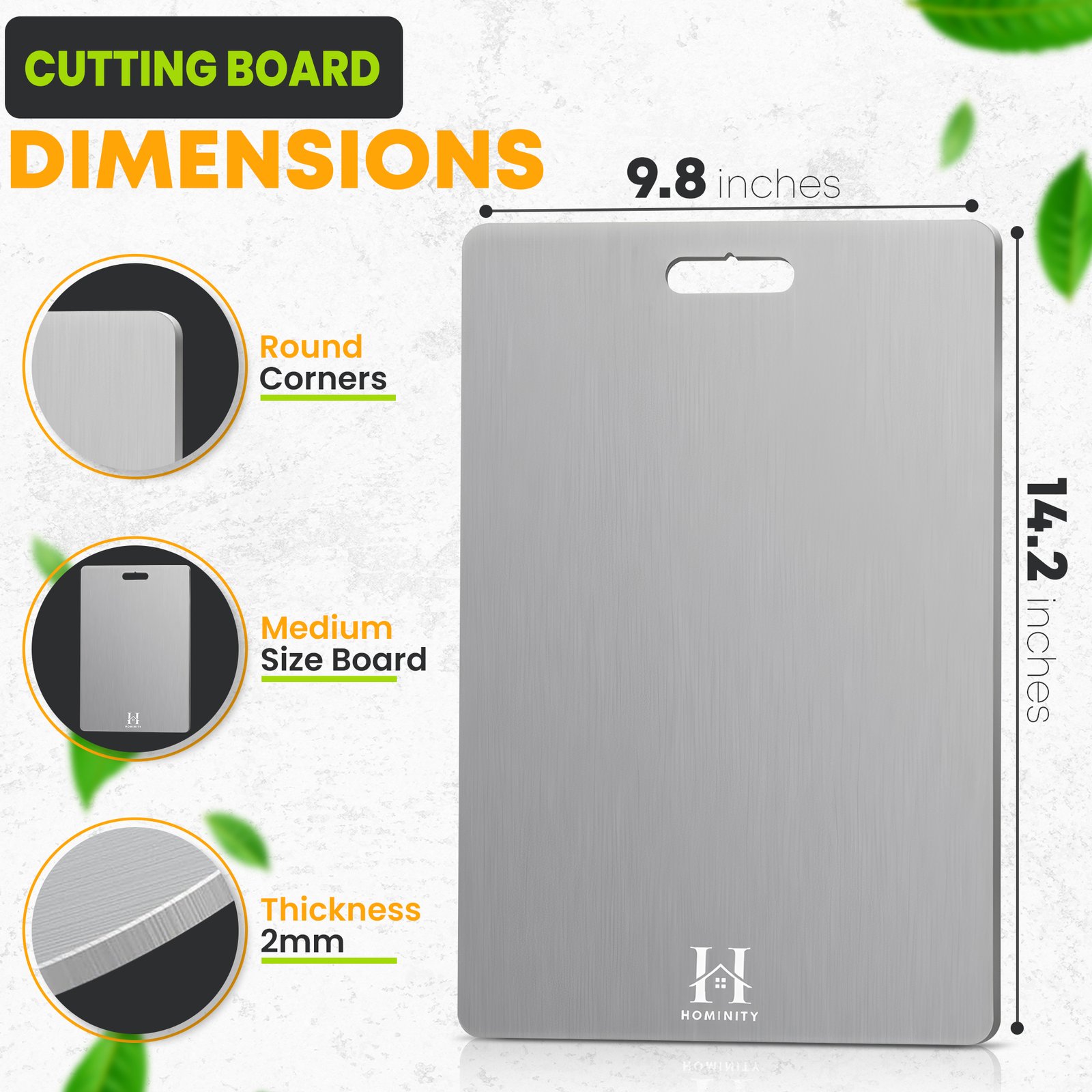- 14.2″ x 9.8″ (large stainless steel cutting board)